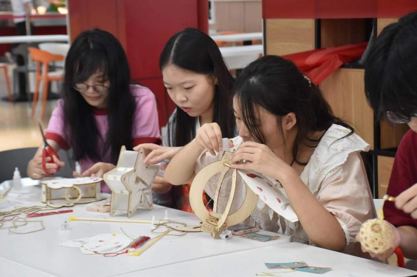 活动伊始,徐黎明向师生们送上了温暖的节日祝福,“中秋节作为我国的传统节日,形式多样、内容丰富,是中华民族悠久历史文化的重要组成部分。”活动现场,由食堂大厨现场教授制作冰皮月饼的方法,“先把面团放在手心里压成一个饼皮,再把馅料包入饼皮内,揉成球,放模具里压一下,冰皮月饼就成了。”同学穿上汉服,欢聚一堂,边做月饼边聊家常,揉搓饼皮、填充馅料……大部分同学都是第一次亲手制作月饼,刚开始的时候手忙脚乱,但在老师和食堂工作人员的帮助下,慢慢掌握了制作技巧,一会儿工夫就做了满满几大盘月饼。参加活动的还有几位少数民族的同学,大家一边制作中秋花灯,一边和同学们交流不同民族庆祝中秋的特色习俗、文化传统。