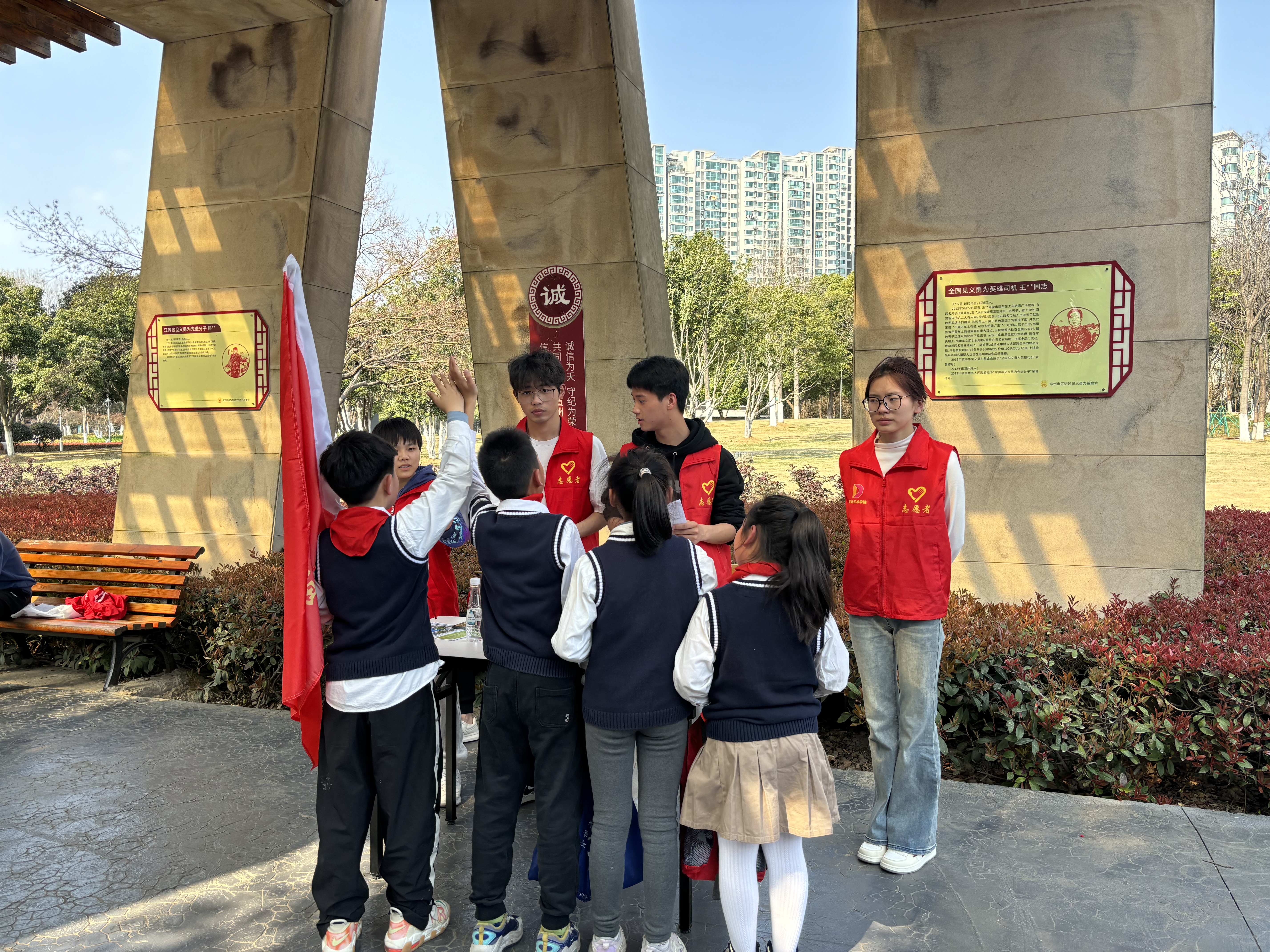 中午,志愿者们先是从学校毅行至新天地公园,沿途宣传节水知识,在花园街上形成一道亮丽的风景线。到达活动现场,志愿者们统一服装,通过悬挂横幅、摆放展板和发放宣传资料等形式宣贯“绿水青山就是金山银山”的绿色发展理念。在小英雄趣味答题闯关活动中,需要家长带着孩子们沿新天地公园环湖步道完成一系列打卡闯关任务,志愿者们配合工作人员沿途完成安全保障工作,一声声叮嘱,一句句提醒,他们身上的“红马甲”为这个春日增添了一抹温暖的色彩。