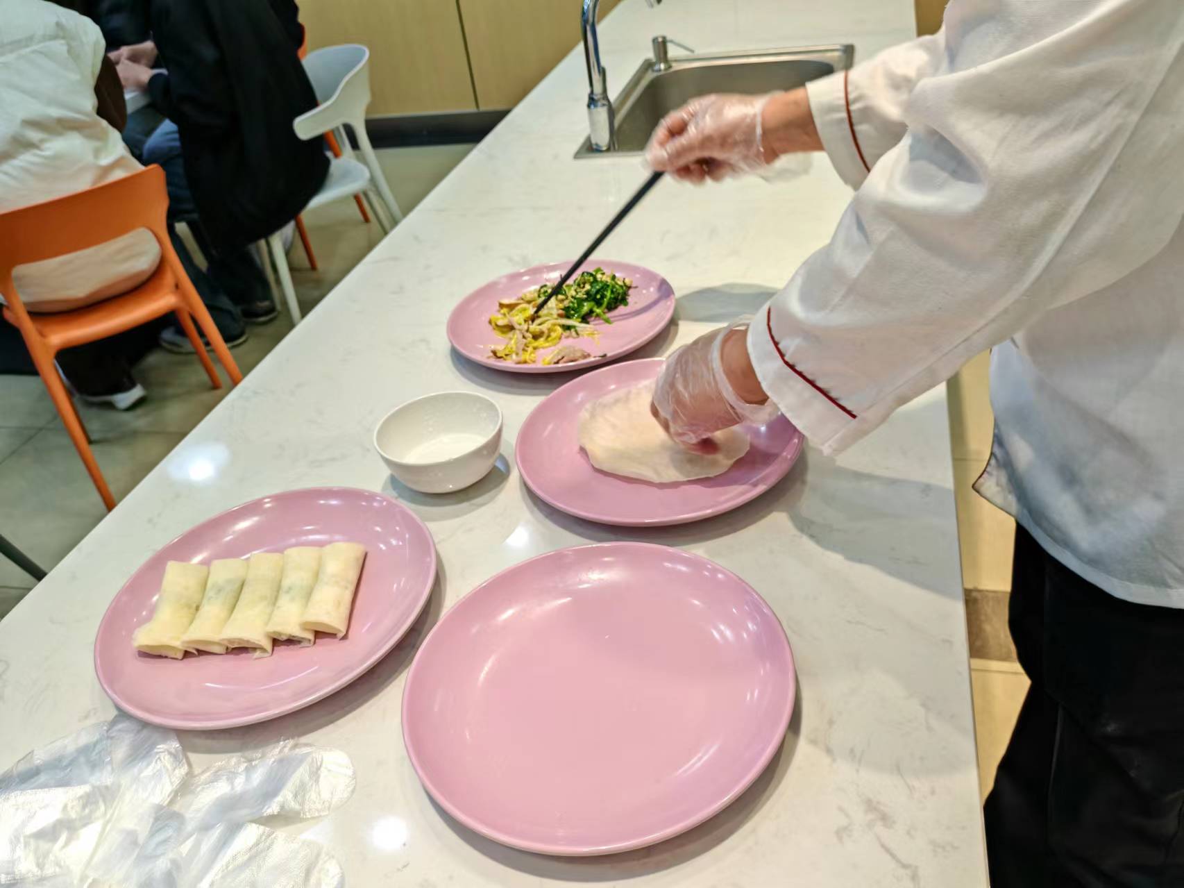 在食堂师傅的带领下,同学们首先了解了春卷的历史和文化。食堂悉心为同学们准备了春卷皮和春卷馅料。随后,师傅演练了包春卷的完整过程,介绍包好春卷的注意事项。学生们分工合作,一些同学负责撕开春卷皮,一些同学负责包春卷,还有的同学则负责整理桌面。最后,后勤师傅组织同学们炸春卷,金黄酥脆的外皮包裹着丰富的馅料,散发着诱人的香味,一个个春卷出炉了。整个过程中,同学们互帮互助,充分展现了团队协作的精神,事后品尝着亲手制作的美味,既是对味蕾的享受,也是对传统文化的传承。