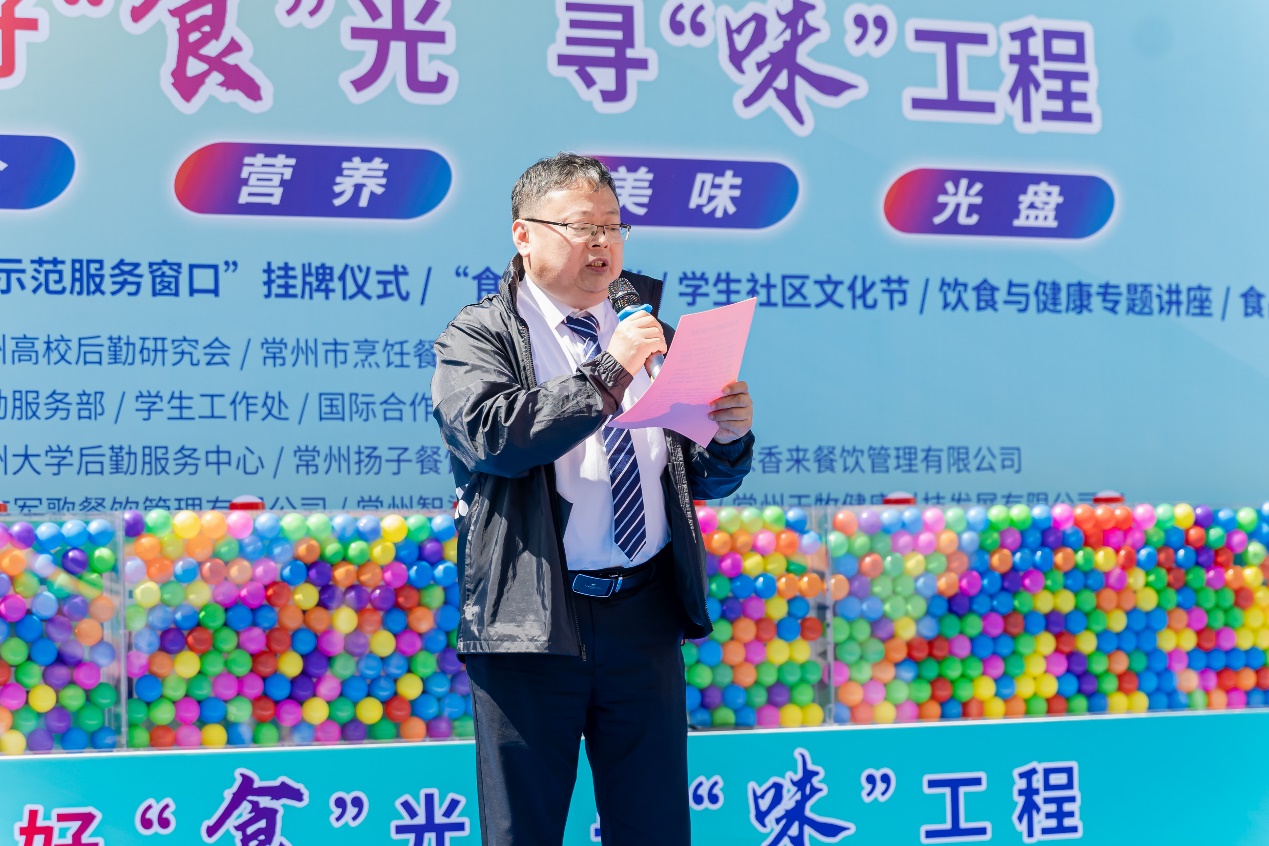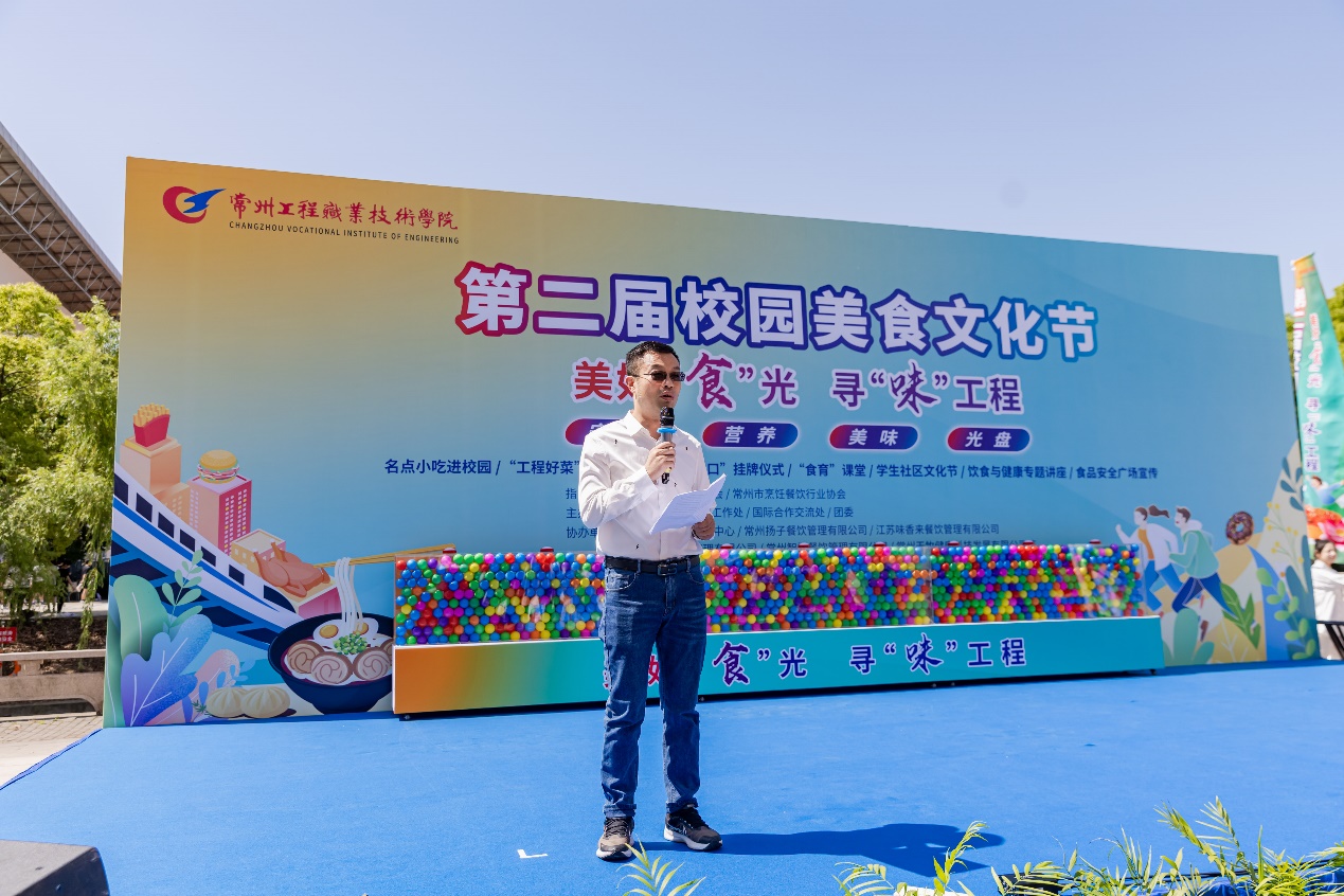 符学平代表常州市烹饪餐饮行业协会在开幕式上发言。他希望以我校美食文化节活动为契机,进一步加强各兄弟高校及各餐饮企业之间的沟通交流,发挥特色、创新服务,满足师生多样化需求,共同推动在常高校后勤工作高质量发展。