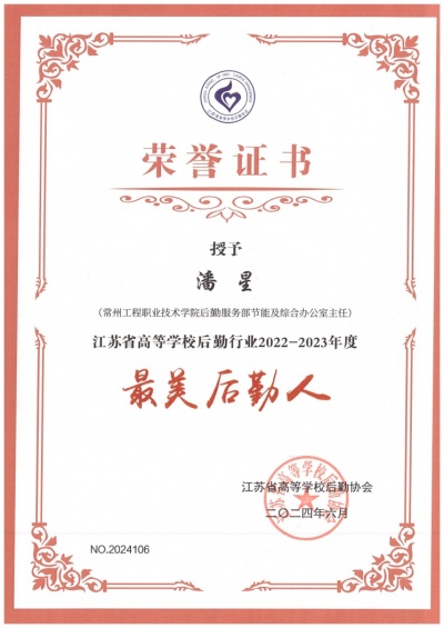 近年来,潘星老师始终坚守在学校后勤服务一线,践行全心全意为师生服务的理念,承担起校园物业服务、水电运行、设备管理、新建项目申报等多项保障服务工作。先后获得“江苏绿色建筑创新示范工程”、常州高校后勤系统“先进个人”等多项荣誉,用热心服务师生,用爱心守护师生,用责任心保障师生。