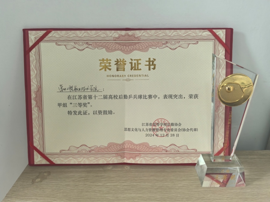 2024年12月27日-29日,江苏省第十二届高校后勤乒乓球比赛在江苏农牧科技职业学院举办。我校派出了以党委委员、副校长周勇为领队,后勤服务部部长周晓东为教练的参赛队伍。我校健儿获得乙组第五名的好成绩,荣获赛事三等奖。