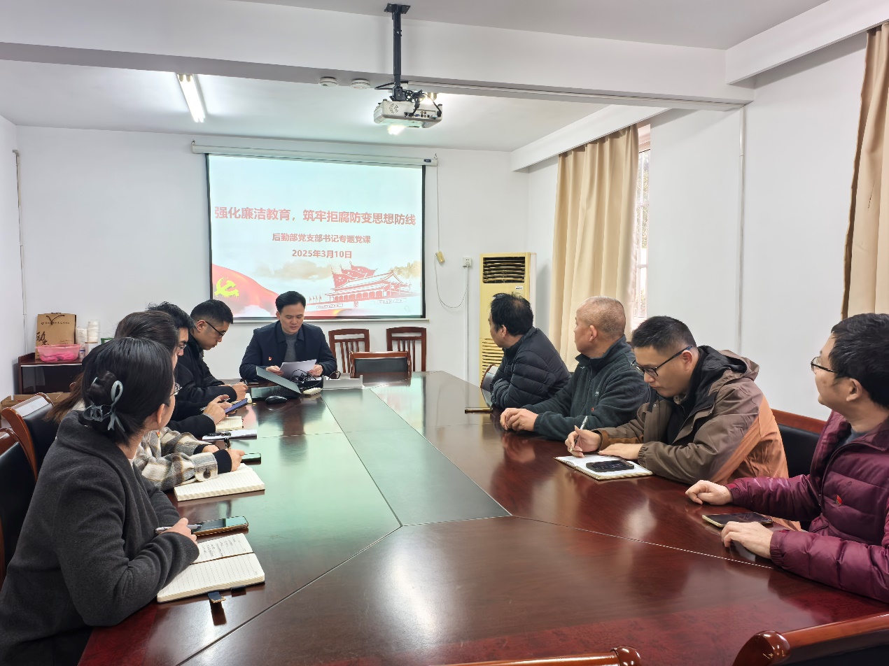 为进一步深入学习贯彻党的二十大和二十届三中全会精神,深刻领会二十届中央纪委四次全会精神,切实增强党员干部廉洁自律意识,筑牢拒腐防变思想防线,3月7日上午,后勤部党支部开展《强化廉洁教育,筑牢拒腐防变思想防线》专题党课学习。