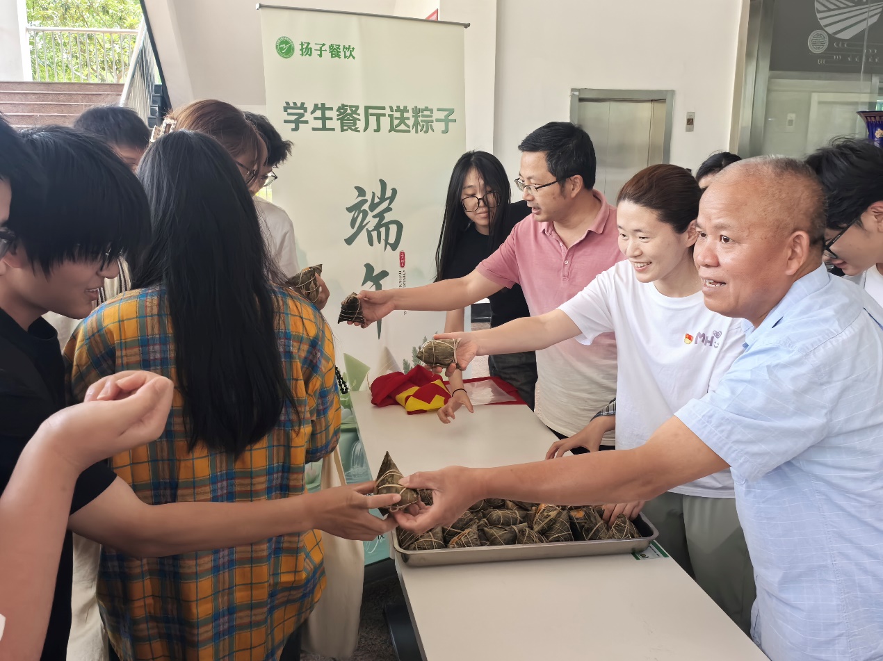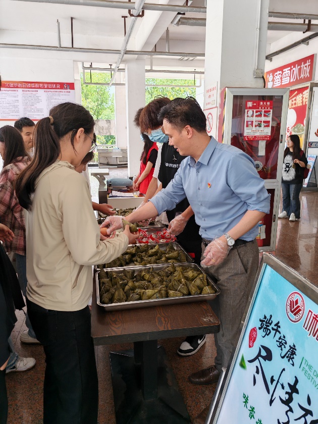 志愿行动践行为民初心。在“粽香传情”志愿行动中,支部党员将精心准备的粽子分发给在校学生,并送上节日祝福。“没想到在学校也能吃到这么暖心的粽子,感谢后勤老师们的贴心安排!”一位收到粽子的同学感动地说。在“平安端午”校园服务,为确保师生度过一个安全祥和的节日,支部党员开展校园安全巡查,重点检查教学楼消防设施、食堂卫生及用电安全,及时排查隐患,筑牢校园安全防线。在“食育课堂”劳动实践中,后勤部党支部与设计学院师生联动,开展包粽子、制作艾草包、装饰鸡蛋等活动,既增添了节日氛围,也让学生在劳动实践中感受传统文化魅力。