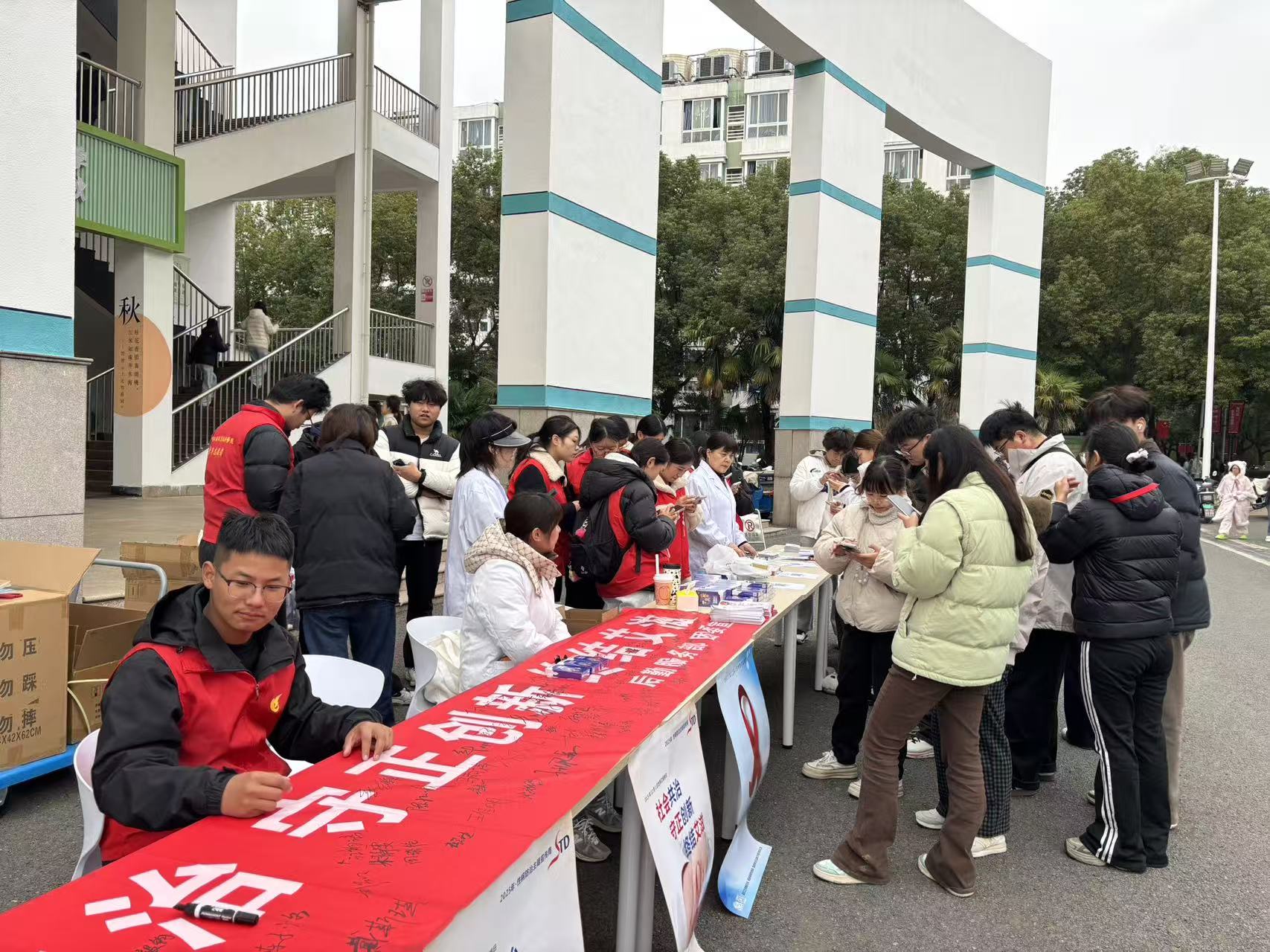 活动现场氛围热烈,“社会共治,守正创新,终结艾滋”的横幅格外醒目,迅速吸引了过往学生的关注。党支部首先组织了防艾抗艾签名活动,党员同志们率先在横幅上郑重签名,以实际行动表达对防艾抗艾工作的坚定支持。随后,不少学生也纷纷加入签名行列,在笔尖落下的瞬间,将防艾抗艾的责任与意识深深镌刻在心中。为精准掌握当代大学生对艾滋病防治知识的认知现状,活动现场设置了调查问卷发放专区。党员志愿者们耐心引导学生填写问卷,问卷内容涵盖艾滋病传播途径、预防方法、消除歧视等知识。“通过填写问卷,我发现自己对一些防艾细节的了解还不够深入,也更清楚了日常防护的重要性。”一名参与问卷填写的学生说道。党员同志们向学生们免费发放防艾健康手册。手册梳理了艾滋病的危害、传播途径、预防措施以及相关救助政策,帮助学生们打破认知误区,建立科学的防艾观念。