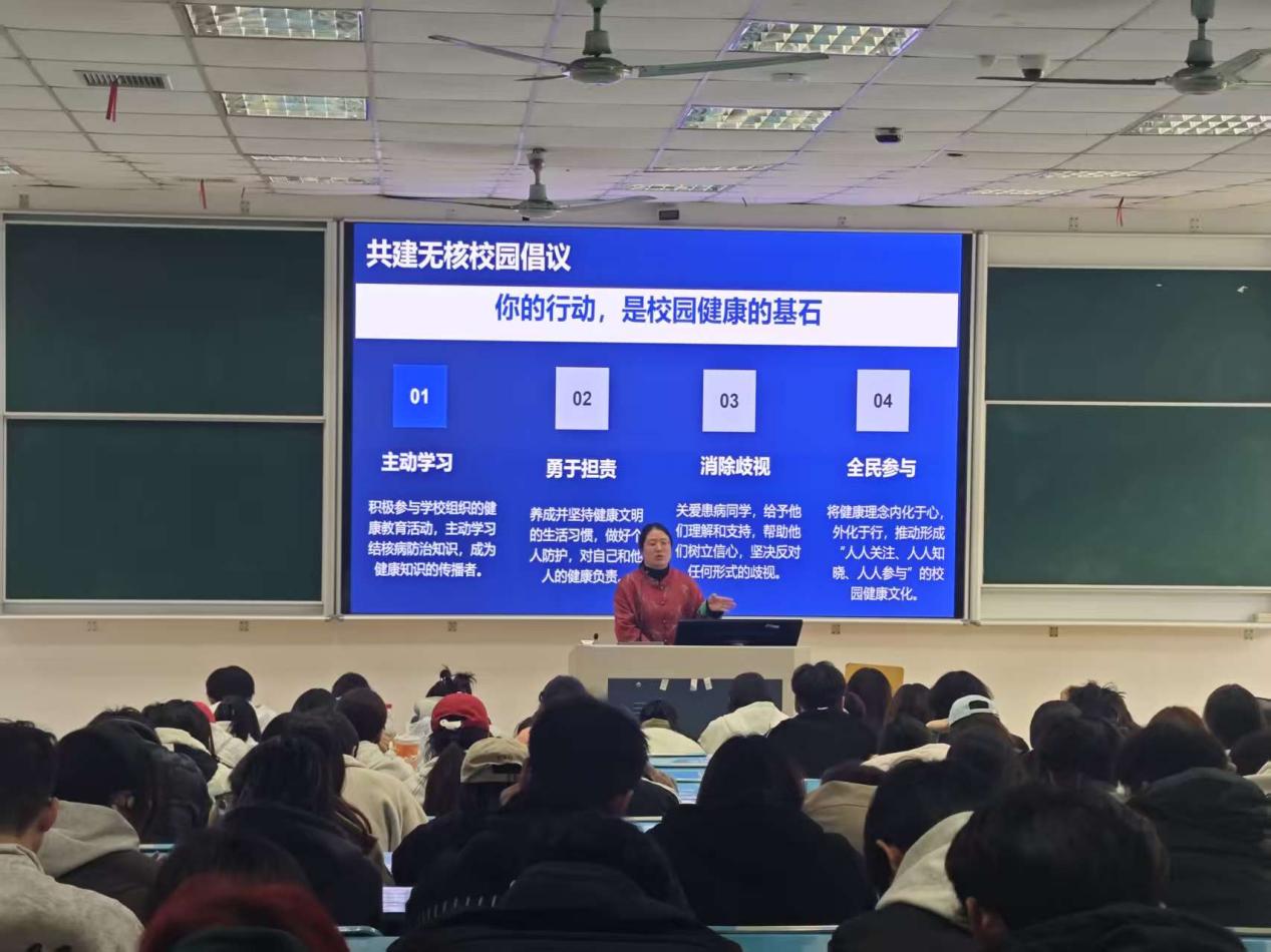 现场学生认真聆听、积极互动,纷纷表示将学以致用,做好自身健康管理,主动传播防治知识。此次讲座有效提升了学生的防控意识与能力,为构建“无结核校园”奠定了坚实基础。(后勤服务部 文/图:邱莉 审核:潘星、张曦、周晓东)